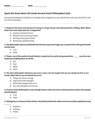 Critical thinking, ethical choices, and purposeful living. Identify how early thinkers like Epicurus and Diogenes viewed happiness and the natural world.