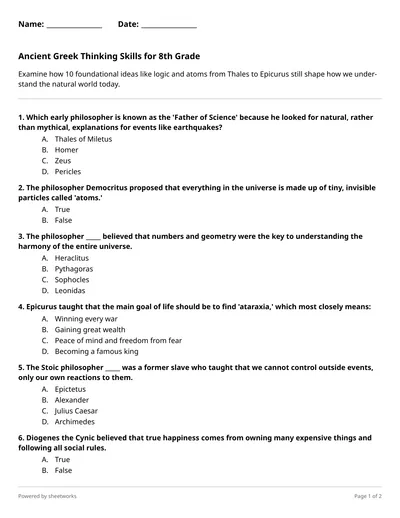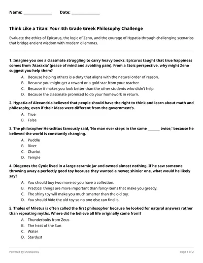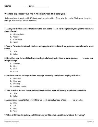 Go beyond simple stories with 10 visual-ready questions identifying wise figures like Thales and Heraclitus through their favorite nature elements.