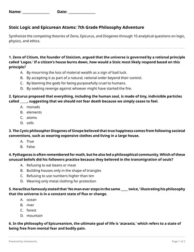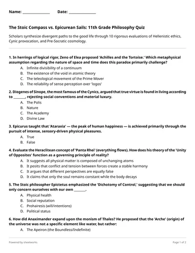Synthesize the competing theories of Zeno, Epicurus, and Diogenes through 10 analytical questions on logic, physics, and ethics.