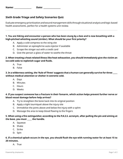 Evaluate emergency prioritization and wound management skills through situational analysis and logic-based health assessments, perfect for a health systems unit review.