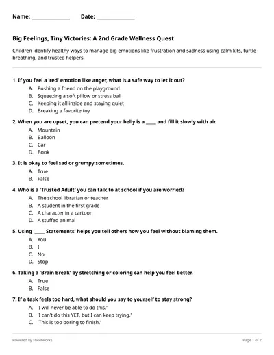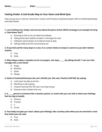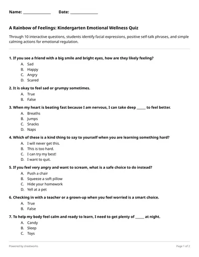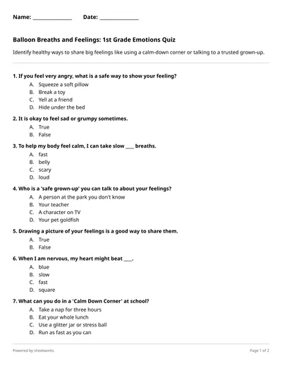 Through 10 interactive questions, students identify facial expressions, positive self-talk phrases, and simple calming actions for emotional regulation.