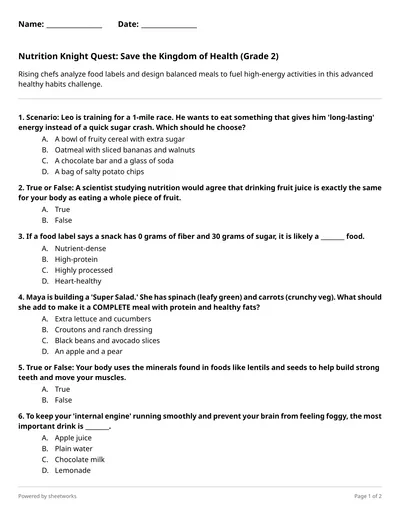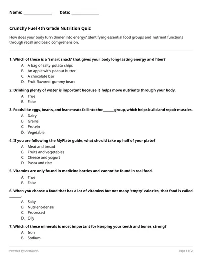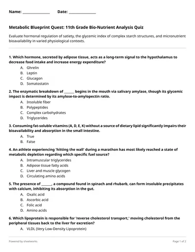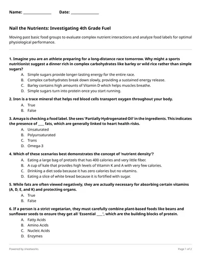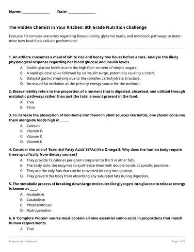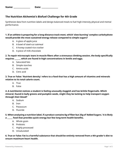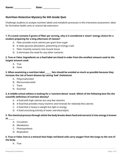 Challenge students to analyze nutrition labels and metabolic processes in this interactive assessment. Ideal for formative health units or science lab extensions.