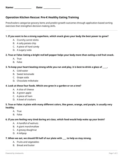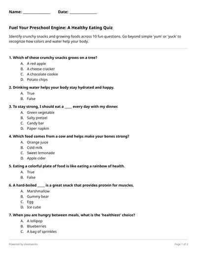 Identify crunchy snacks and growing foods across 10 fun questions. Go beyond simple 'yum' or 'yuck' to recognize how colors and water help your body.