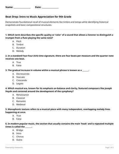 Demonstrate foundational recall of musical elements like timbre and tempo while identifying historical snapshots and basic compositional structures.