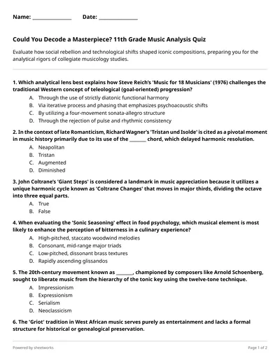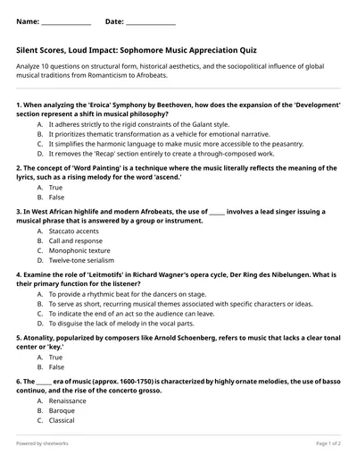 Analyze 10 questions on structural form, historical aesthetics, and the sociopolitical influence of global musical traditions from Romanticism to Afrobeats.