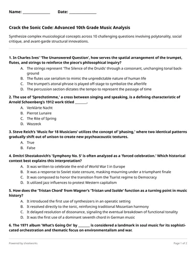Synthesize complex musicological concepts across 10 challenging questions involving polytonality, social critique, and avant-garde structural innovations.