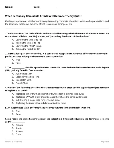 Challenge sophomores with harmonic analysis covering chromatic alterations, voice-leading resolutions, and the structural function of the circle of fifths in complex arrangements.