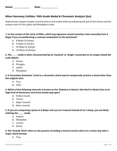 Sophomores analyze complex chord functions and modal shifts by evaluating the pull of the tritone and the unique colors of the Lydian and Mixolydian scales.
