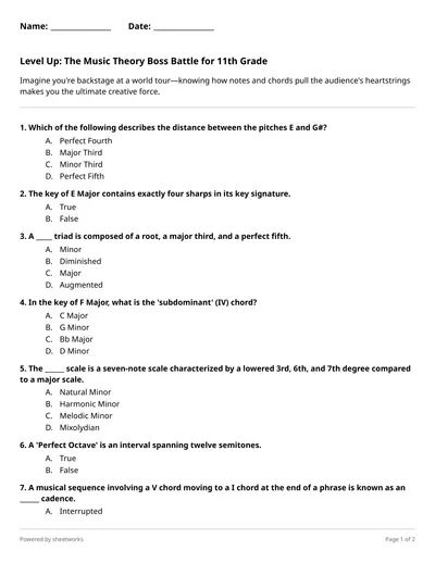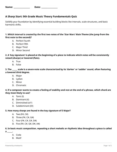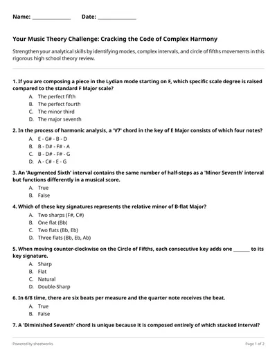 Strengthen your analytical skills by identifying modes, complex intervals, and circle of fifths movements in this rigorous high school theory review.