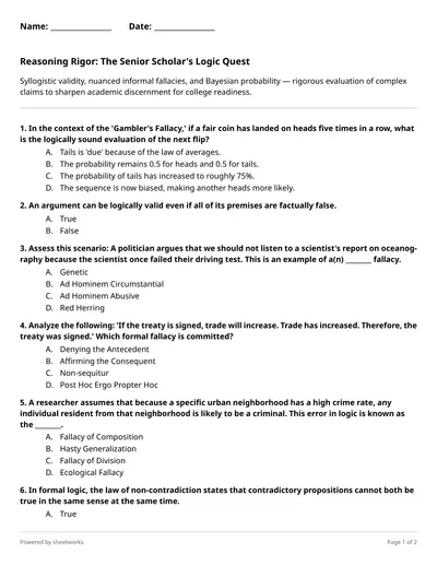 Syllogistic validity, nuanced informal fallacies, and Bayesian probability — rigorous evaluation of complex claims to sharpen academic discernment for college readiness.