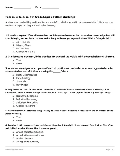 Analyze structural validity and identify common informal fallacies within relatable social and historical scenarios to sharpen sixth-grade evaluative thinking.