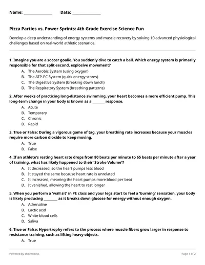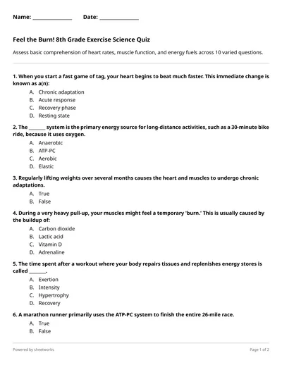 Assess basic comprehension of heart rates, muscle function, and energy fuels across 10 varied questions.