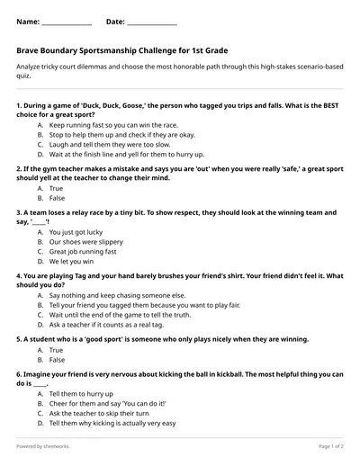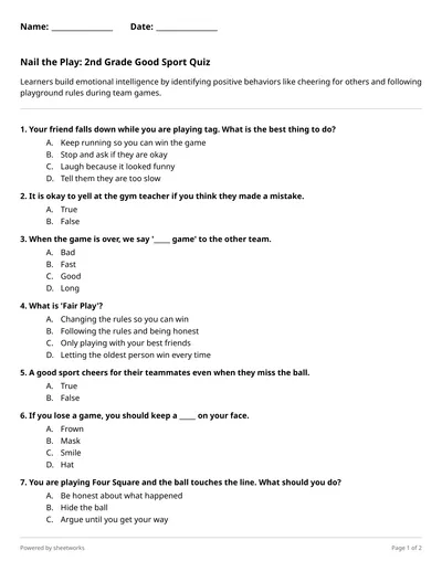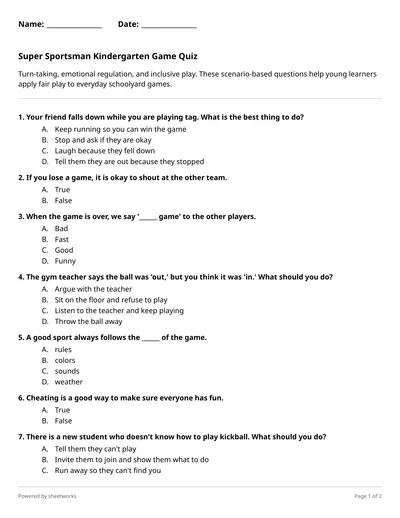 Turn-taking, emotional regulation, and inclusive play. These scenario-based questions help young learners apply fair play to everyday schoolyard games.