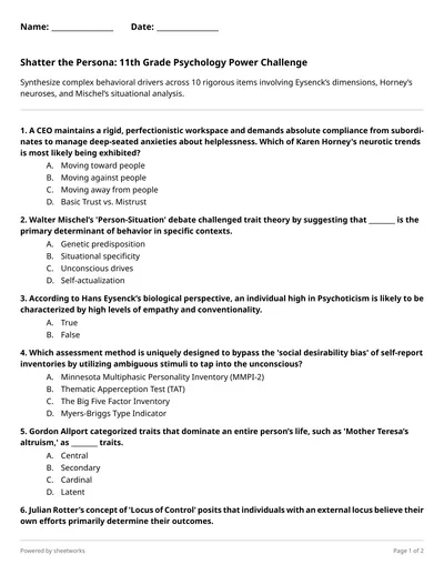 Synthesize complex behavioral drivers across 10 rigorous items involving Eysenck’s dimensions, Horney’s neuroses, and Mischel’s situational analysis.