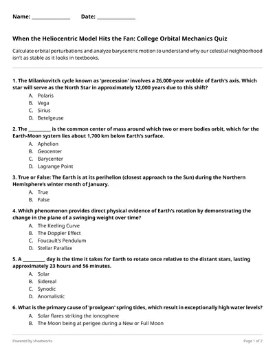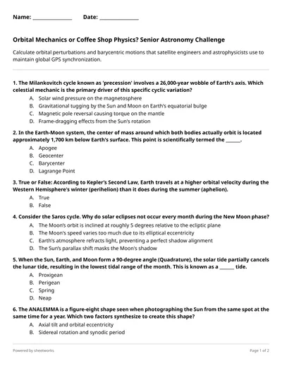 Learners analyze orbital perturbations and gravitational nuances through 10 high-level challenges focused on celestial mechanics and Earth's positioning.