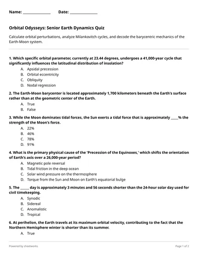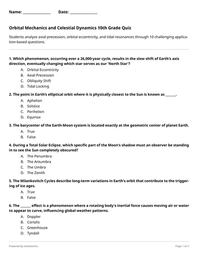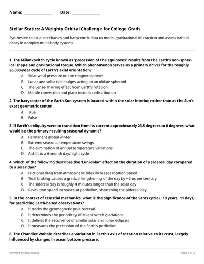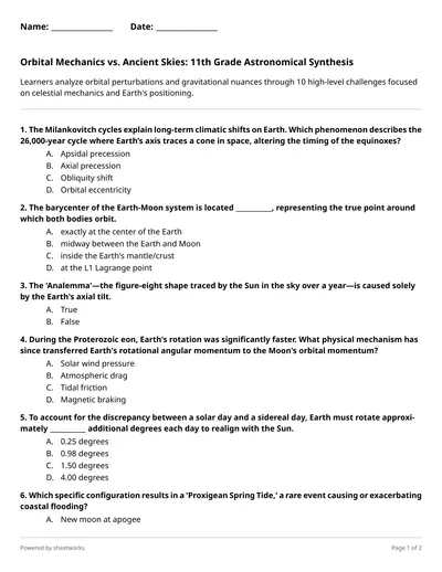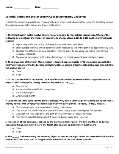 Students analyze axial precession, orbital eccentricity, and tidal resonances through 10 challenging application-based questions.